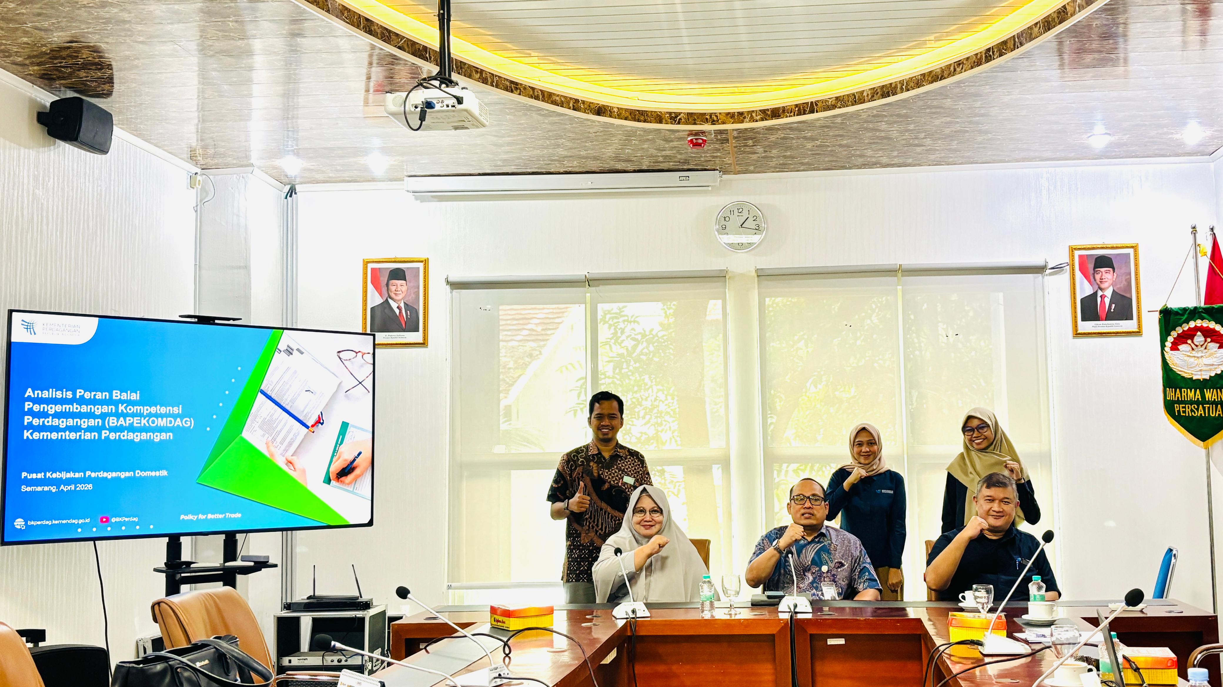 Pusat Kebijakan Perdagangan Domestik, Badan Kebijakan Perdagangan, telah melaksanakan survei di Kota Semarang, Provinsi Jawa Tengah, pada 7–11 April 2026. Kegiatan ini merupakan bagian dari rangkaian Analisis Peran Balai Pengembangan Kompetensi Perdagangan dalam Pengembangan Kompetensi Nonaparatur Perdagangan. Survei difokuskan pada wawancara dan observasi lapangan untuk mengumpulkan informasi dan data dari berbagai pemangku kepentingan, meliputi instansi pemerintah, akademisi, dan pelaku usaha. Responden antara lain Dinas Perdagangan Kota Semarang, Dinas Koperasi dan Usaha Mikro Kota Semarang, BKPP Kota Semarang, Fakultas Ekonomi dan Bisnis Universitas Negeri Semarang (UNNES), serta pelaku usaha di Kota Semarang. Kegiatan ini bertujuan menghimpun masukan strategis terkait penentuan prioritas sasaran pengembangan kompetensi, penyusunan topik dan materi pelatihan yang sesuai kebutuhan, serta penguatan kerja sama antara Balai Pengembangan Kompetensi Perdagangan dan para pemangku kepentingan. Upaya ini merupakan bagian dari komitmen Kementerian Perdagangan dalam memperkuat kualitas sumber daya manusia perdagangan guna mendorong terciptanya ekosistem perdagangan domestik yang berdaya saing, inklusif, dan berkelanjutan. (SH)