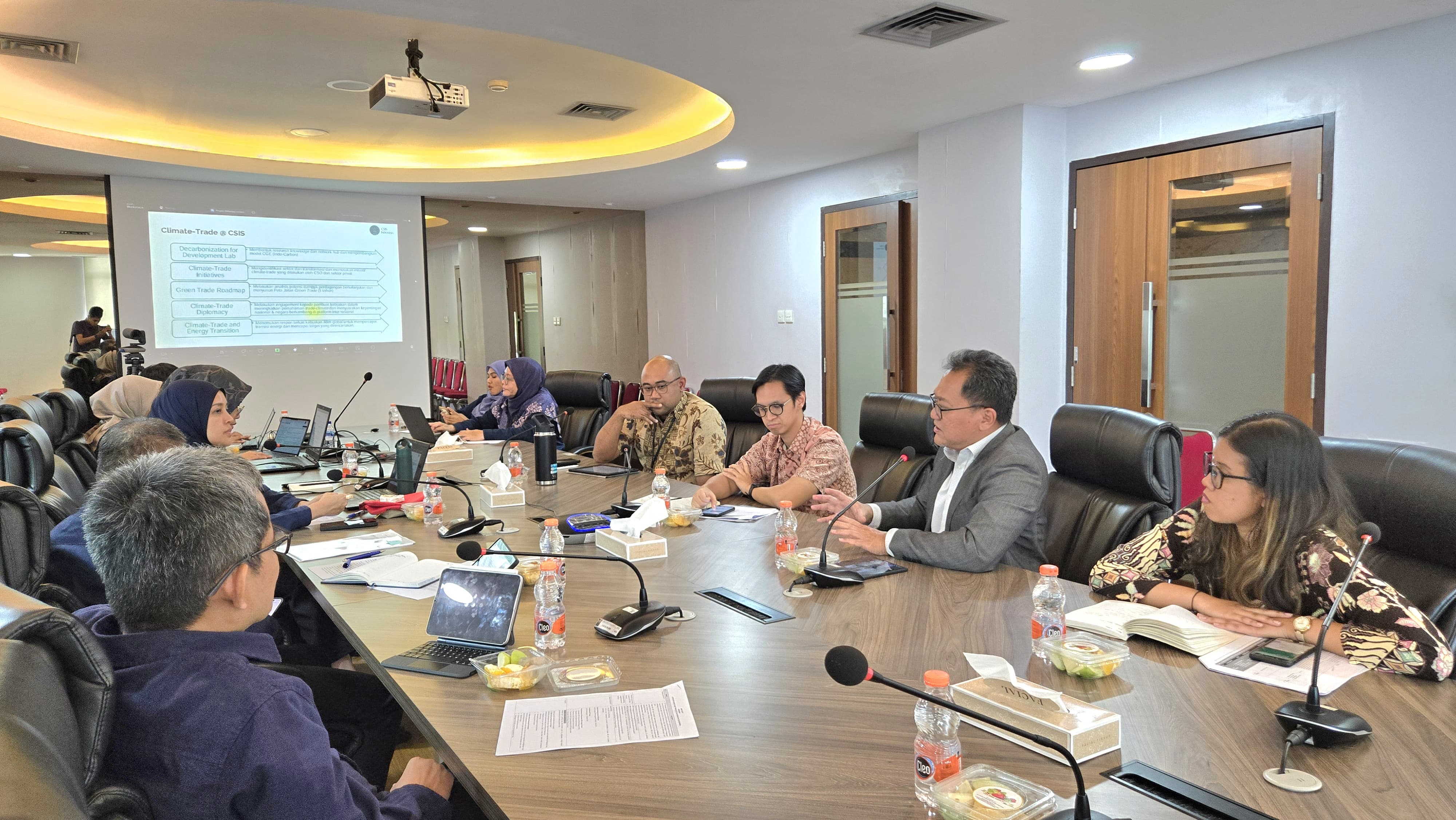 Kepala Badan Kebijakan Perdagangan (BKPerdag), Rusmin Amin menerima kunjungan perwakilan Center for Strategic and International Studies (CSIS) Indonesia pada hari Rabu (19/2/25) di Kementerian Perdagangan. Dalam pertemuan tersebut perwakilan CSIS Indonesia dipimpin oleh Yose Rizal Damuri selaku Direktur Eksekutif CSIS Indonesia. Adapun kunjungan dilaksanakan dalam rangka menindaklanjuti pelaksanaan program Action on Climate and Trade (ACT) yang merupakan kolaborasi antara BKPerdag dengan World Bank, World Trade Organization, dan World Economic Forum dalam melakukan diskusi pembahasan hubungan antara perdagangan dengan perubahan iklim. Dalam pertemuan tersebut CSIS Indonesia menjelaskan mengenai penyusunan peta jalan Perdagangan Berkelanjutan Indonesia yang direncanakan akan dilaksanakan selama tiga tahun. Diharapkan dengan adanya peta jalan ini dapat meningkatkan sinergi dan kolaborasi yang lebih baik lagi antara BKPerdag dengan CSIS Indonesia terutama terkait Perdagangan Berkelanjutan Indonesia. Turut hadir dalam pertemuan tersebut Sekretaris Badan Kebijakan Perdagangan. (AS)