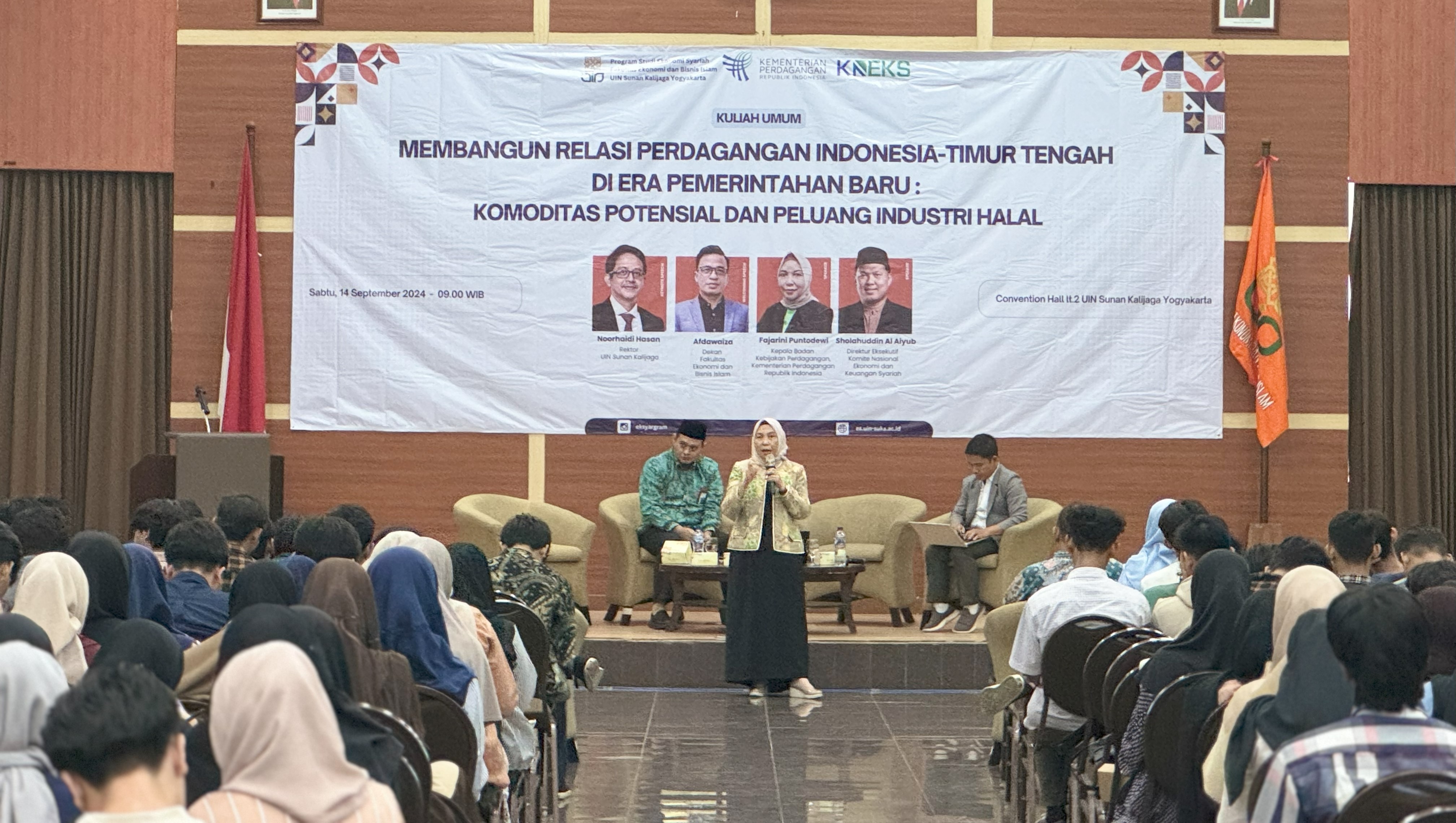 Kepala Badan Kebijakan Perdagangan (BKPerdag), Fajarini Puntodewi memberikan Kuliah Umum pada Sabtu (14/9/24) di Fakultas Ekonomi dan Bisnis Islam (FEBI) Universitas Islam Negeri (UIN) Sunan Kalijaga, Yogyakarta. Kuliah Umum diikuti oleh lebih dari 100 mahasiswa dari jenjang S1, S2, dan S3. Dalam kesempatan tersebut, Kepala BKPerdag menyampaikan materi tentang Membangun Relasi Perdagangan Indonesia-Timur Tengah di Era Pemerintahan Baru dengan Komoditas Potensial dan Peluang Industri Halal. Kuliah Umum dibuka oleh Wakil Dekan FEBI UIN Sunan Kalijaga Yogyakarta, Misnen Ardiansyah dan menghadirkan narasumber lainnya, yaitu Direktur Eksekutif Komite Nasional Ekonomi dan Keuangan Syariah, Sholahuddin Al Aiyub. Turut hadir mendampingi dalam kegiatan, Kepala Pusat Kebijakan Ekspor Impor dan Pengamanan Perdagangan serta Ketua Tim Kerja Sama BKPerdag. (AIP)