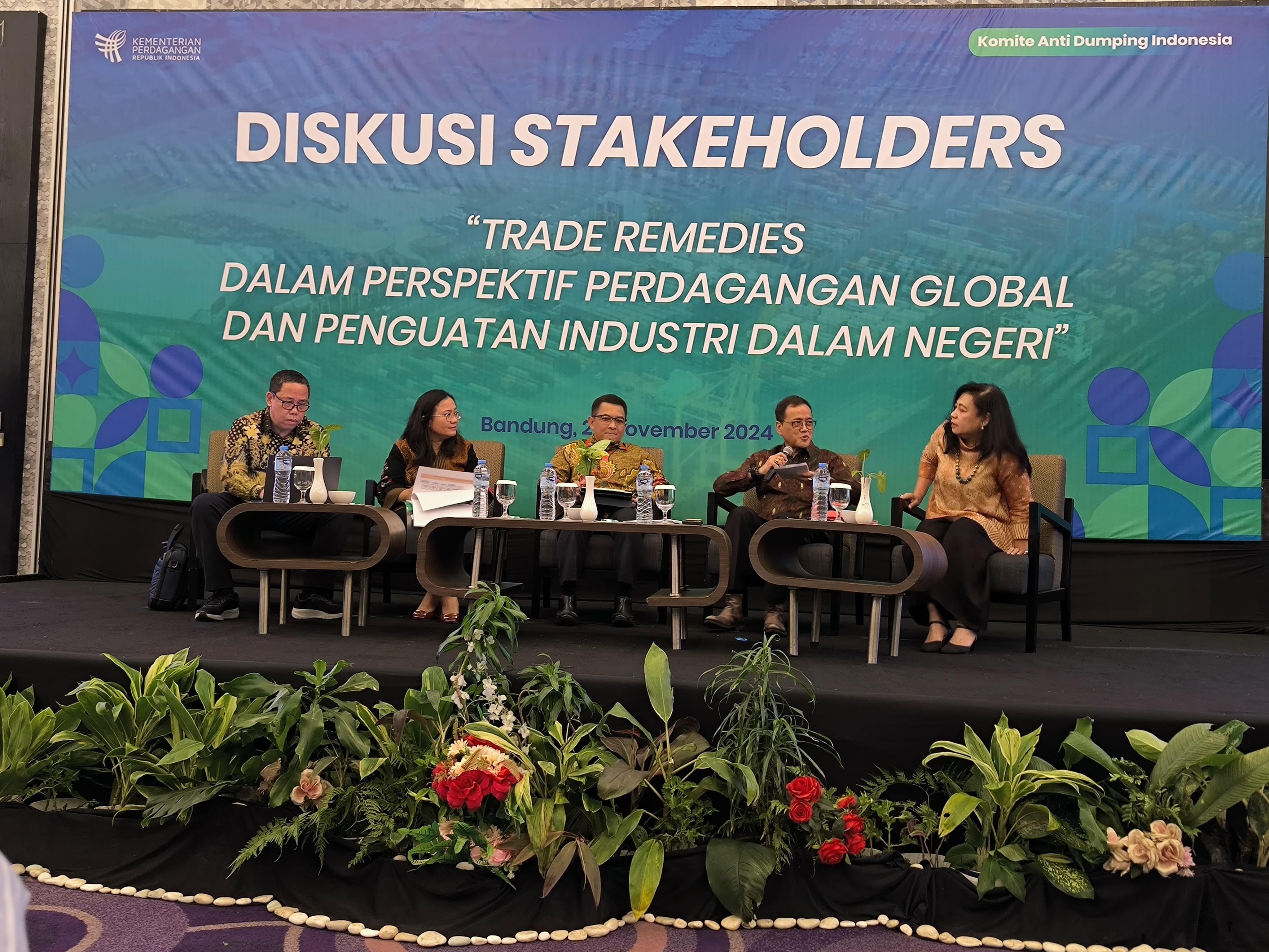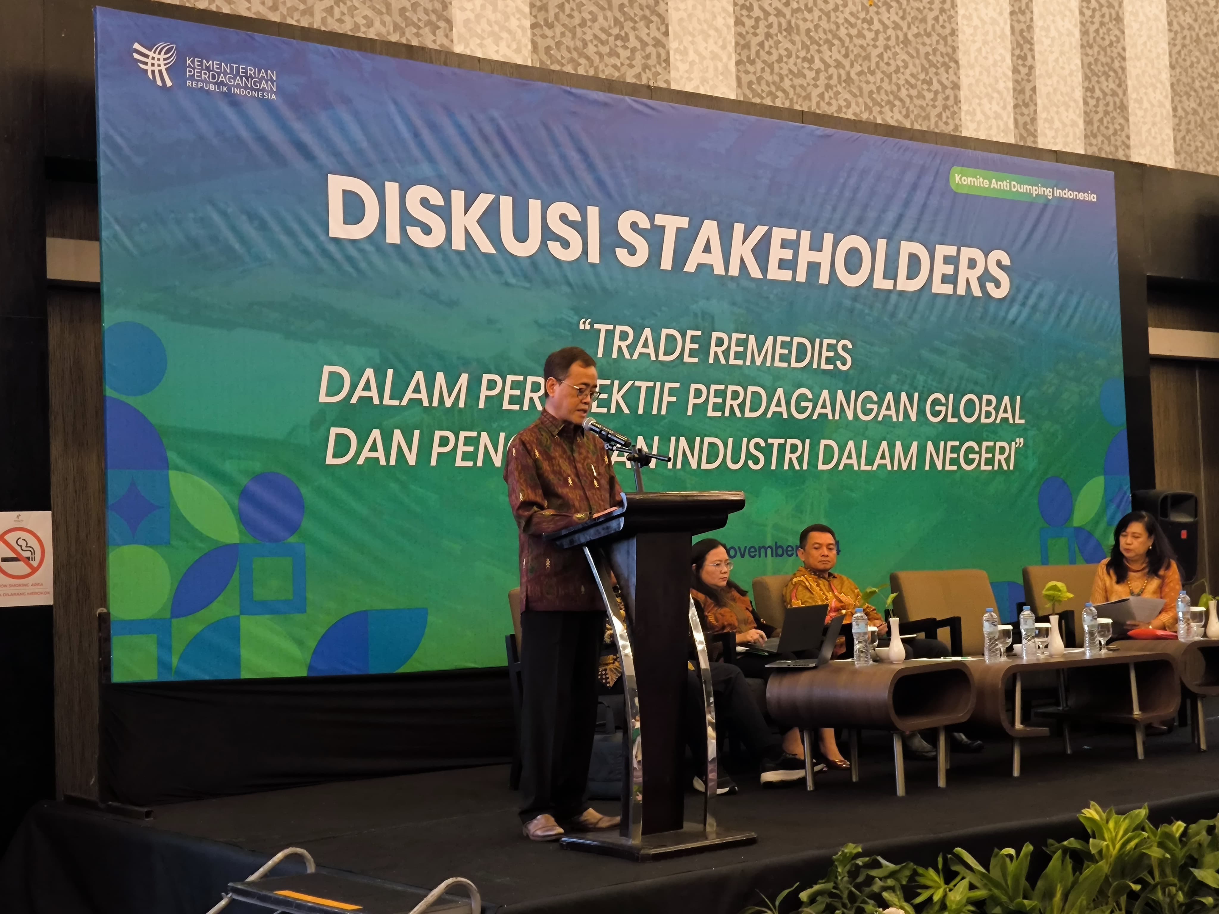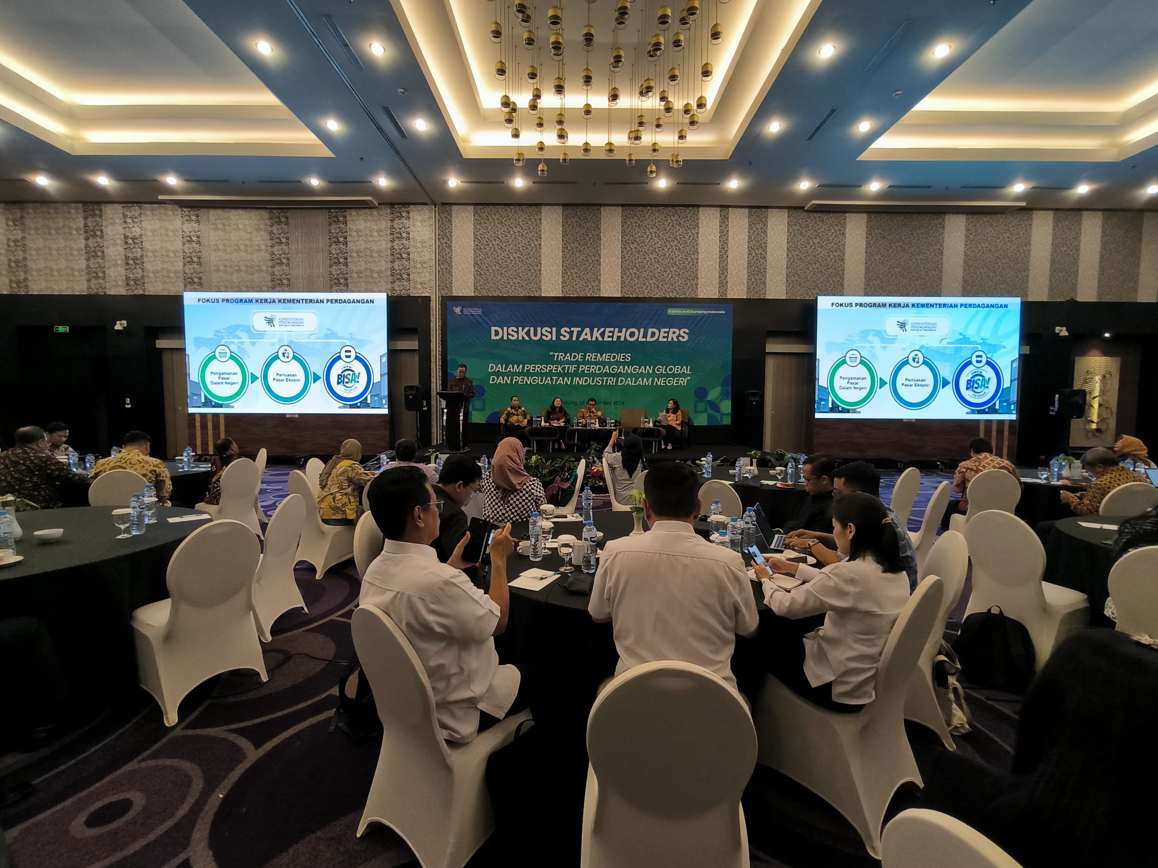 Sekretaris Badan Kebijakan Perdagangan (BKPerdag), Ari Satria mewakili Kepala BKPerdag selaku Ketua Tim Pertimbangan Kepentingan Nasional (Tim PKN) menjadi pembicara dalam Diskusi Stakeholders dengan tema Trade Remedies dalam Perspektif Perdagangan Global dan Penguatan Industri Dalam Negeri pada Kamis (28/11/24) di Hotel Holiday Inn, Bandung. Dalam kesempatan tersebut, Sekretaris BKPerdag menyampaikan Kebijakan Strategis Pemerintah Dalam Penguatan Instrumen Trade Remedies Untuk Melindungi Industri Dalam Negeri. Acara dibuka oleh Wakil Menteri Perdagangan dengan menghadirkan pembicara lainnya, yaitu Staf Ahli Bidang Penerimaan Negara Kementerian Keuangan, Direktur Pengamanan Perdagangan Kementerian Perdagangan, dan Direktur Ketahanan dan Iklim Usaha Industri Kementerian Perindustrian. Adapun peserta kegiatan adalah anggota Tim PKN di lingkungan Kementerian Perdagangan, K/L terkait, serta pelaku usaha dan asosiasi. Workshop diselenggarakan oleh Komite Anti Dumping Indonesia (KADI) dengan tujuan untuk meningkatkan pemahaman atas kebijakan trade remedies sebagai salah satu upaya dalam memperkuat industri dalam negeri dan memberikan perlindungan terhadap investasi serta peningkatan daya saing industri dalam negeri. (AS)
