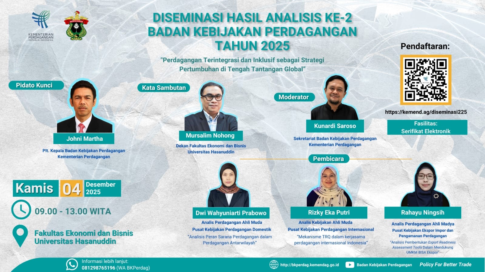 Diseminasi Hasil Analisis BKPerdag ke-2 bekerjasama dengan FEB Universitas Hasanuddin dengan tema: "Perdagangan Terintegrasi dan Inklusif sebagai Strategi Pertumbuhan di Tengah Tantangan Global"