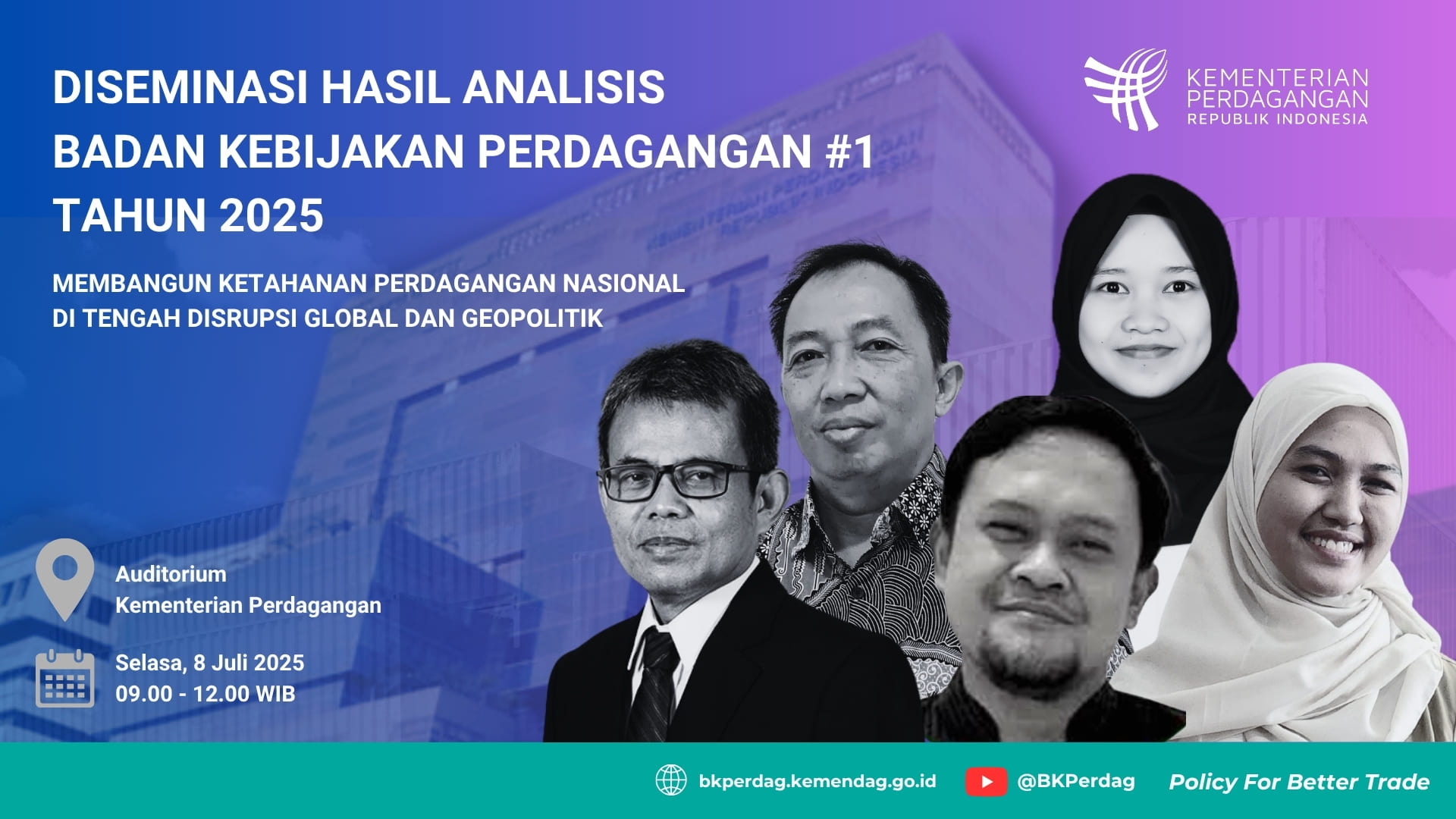 Diseminasi Hasil Analisis BKPerdag merupakan sarana sosialisasi BKPerdag dalam menyampaikan hasil analisis yang dihasilkan oleh Pusat Kebijakan Perdagangan Domestik, Pusat Kebijakan Perdagangan Internasional, dan Pusat Kebijakan Ekspor Impor dan Pengamanan Perdagangan kepada masyarakat luas. Kegiatan berlangsung secara Hibrida dan dapat disaksikan melalui kanal YouTube Badan Kebijakan Perdagangan