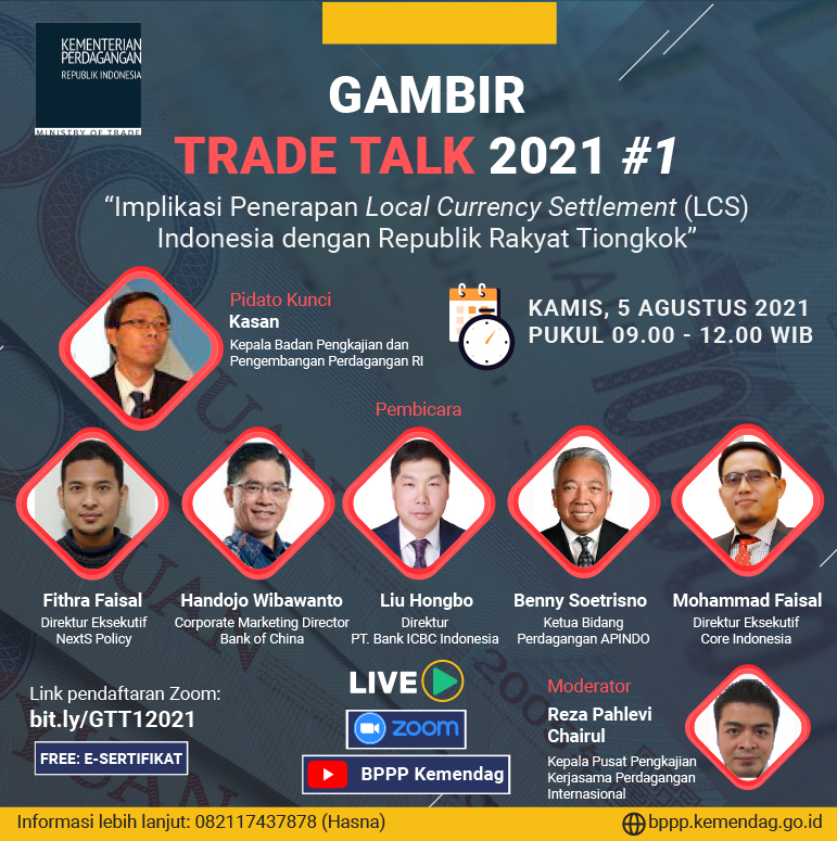 Badan Pengkajian dan Pengembangan Perdagangan (BPPP) melaksanakan kegiatan webinar bertajuk GAMBIR TRADE TALK (GTT) #1 dengan judul “Implikasi Penerapan Local Currency Settlement (LCS) Indonesia dengan Republik Rakyat Tiongkok (RRT)” pada hari Kamis, 5 Agustus 2021 yang akan di selenggarakan secara virtual melalui platform Zoom dan live streaming Youtube.
