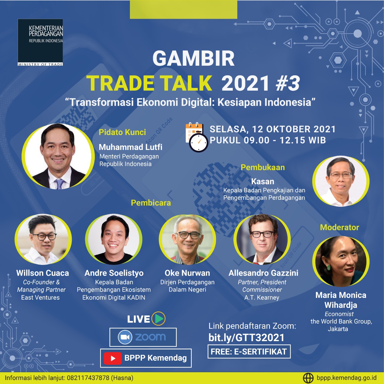 Badan Pengkajian dan Pengembangan Perdagangan (BPPP) akan melaksanakan kegiatan webinar bertajuk GAMBIR TRADE TALK (GTT) #3 dengan judul “Transformasi Ekonomi Digital: Kesiapan Indonesia” pada hari Selasa, 12 Oktober 2021 yang akan di selenggarakan secara virtual melalui platform Zoom dan live streaming Youtube.