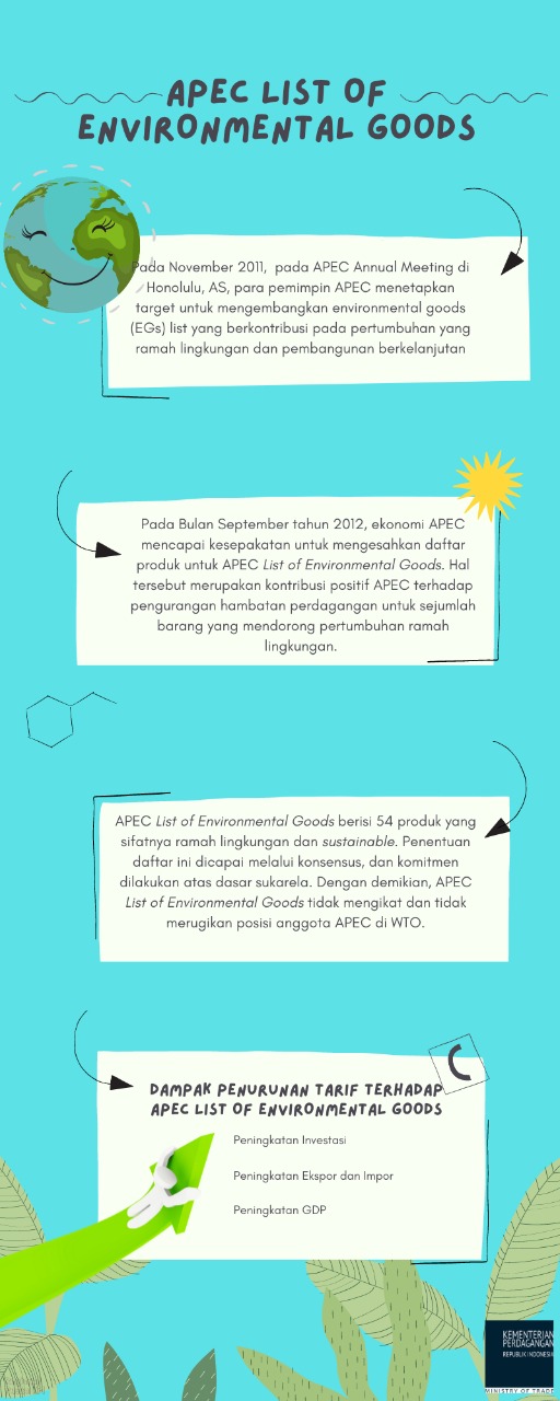 APEC LIST OF ENVIRONMENTAL GOODS. Pada November 2011, pada APEC Annual Meeting di Honolulu, AS, para pemimpin APEC menetapkan target untuk mengembangkan environmental goods (EGs) list yang berkontribusi pada pertumbuhan yang ramah lingkungan dan pembangunan berkelanjutan.Pada Bulan September tahun 2012, ekonomi APEC mencapai kesepakatan untuk mengesahkan daftar produk untuk APEC List of Environmental Goods. Hal tersebut merupakan kontribusi positif APEC terhadap pengurangan hambatan perdagangan untuk sejumlah barang yang mendorong pertumbuhan ramah lingkungan.APEC List of Environmental Goods berisi 54 produk yang sifatnya ramah lingkungan dan sustainable. Penentuan daftar ini dicapai melalui konsensus, dan komitmen dilakukan atas dasar sukarela. Dengan demikian, APEC List of Environmental Goods tidak mengikat dan tidak merugikan posisi anggota APEC di WTO.DAMPAK PENURUNAN TARIF TERHADAP APEC LIST OF ENVIRONMENTAL GOODS Peningkatan Investasi Peningkatan Ekspor dan Impor Peningkatan GDP