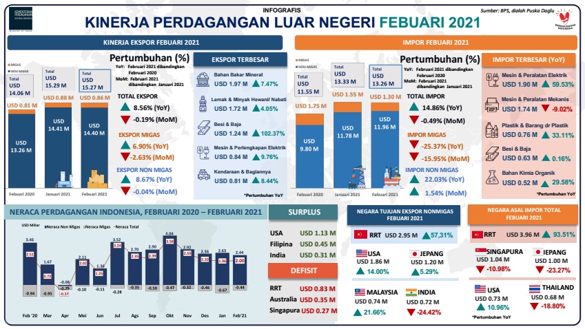 Indonesia Melanjutkan Trend Surplus Perdagangan pada Februari 2021. Kinerja Perdagangan Ekspor Impor Periode Maret 2021