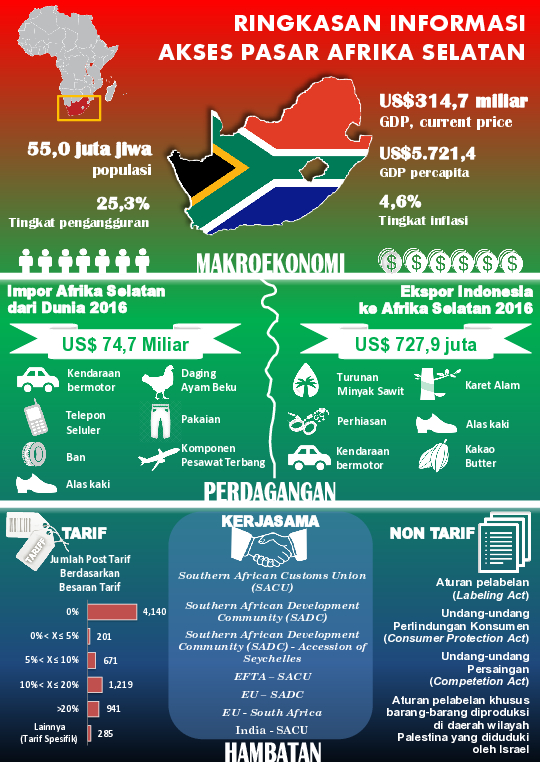 Infografis Informasi Akses Pasar Afrika Selatan. Afrika Selatan merupakan salah satu pasar tujuan ekspor non tradisional bagi Indonesia. Afrika Selatan adalah salah satu anggota Southern African Customs Union (SACU) dengan anggota lainnya yaitu Botswana, Lesotho, Namibia, dan Swaziland. Indonesia memiliki peluang untuk melakukan diversifikasi pasar tujuan ekspor ke Afrika Selatan sekaligus menjadikannya sebagai hub untuk melakukan penetrasi pasar ke negara anggota SACU lainnya.