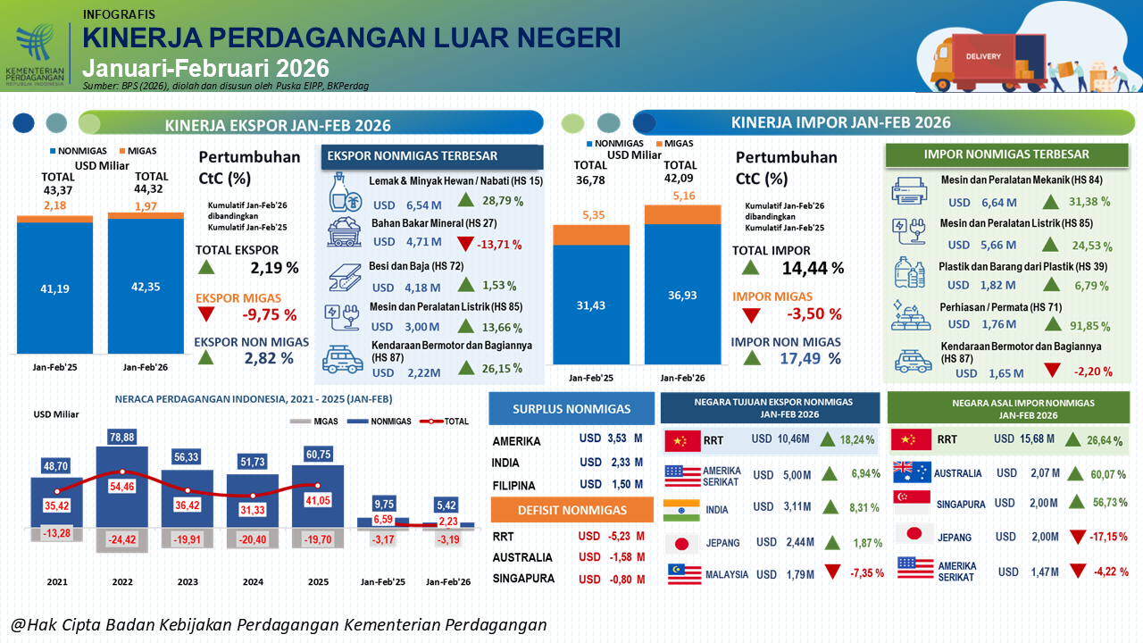 Kinerja Ekspor Impor Indonesia Periode Januari-Februari 2026. Kinerja Ekspor Impor Indonesia Periode Januari-Februari 2026